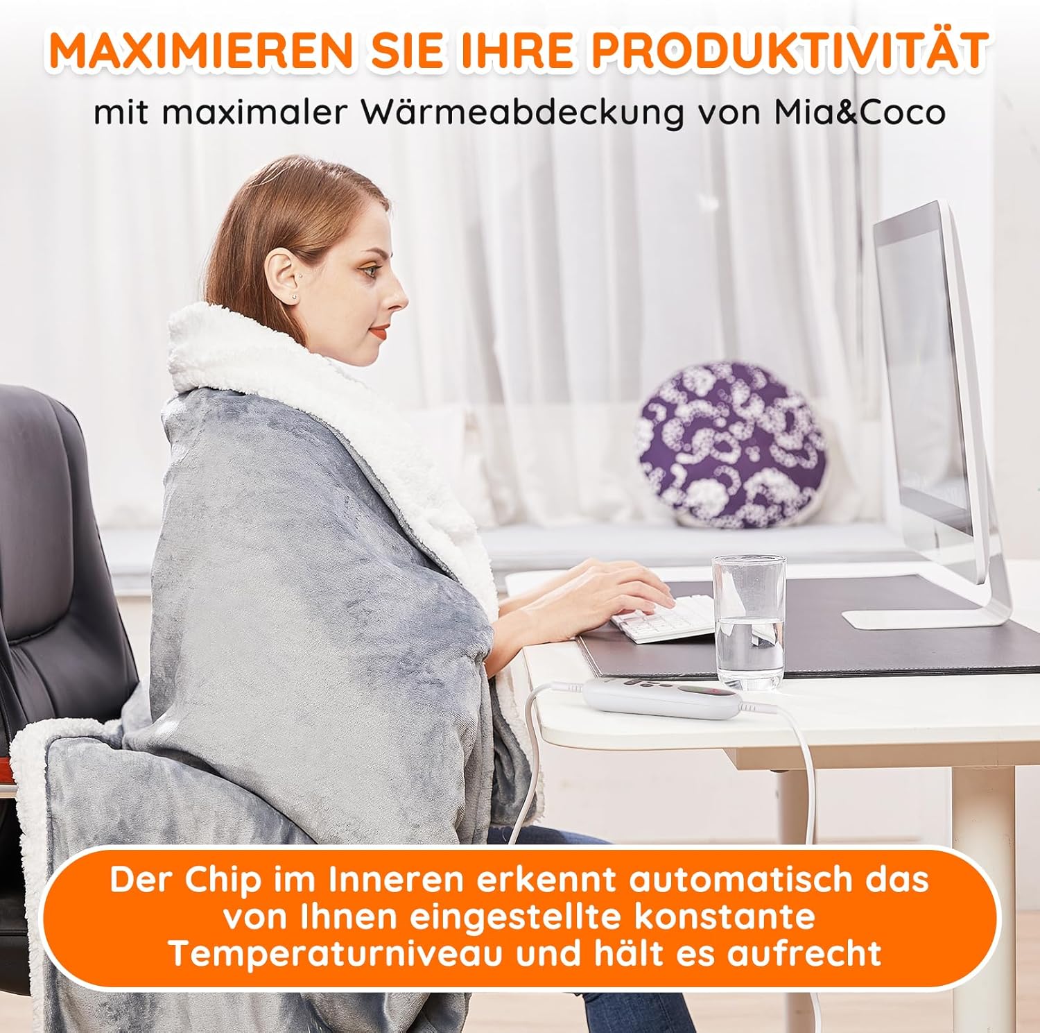 Die elektrische Heizdecke von Mia & Coco (130 x 160 cm) bietet Wärme und Komfort für kalte Wintertage. Mit 10 einstellbaren Temperaturstufen und einem Auto-Off-Timer, der bis zu 9 Stunden einstellbar ist, sorgt sie für Sicherheit und Energieeffizienz. Sie besteht aus weichem Flanell und Sherpa-Material, das für ein angenehmes Wohlgefühl sorgt.