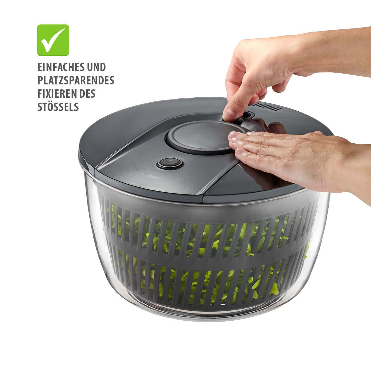 Mit dem praktischen „Stopp“-Button lässt sich der Schleudervorgang jederzeit sicher beenden. Ein rutschfester Silikonring im Boden sorgt für stabilen Halt während der Nutzung. Die Schüssel und das Sieb sind spülmaschinengeeignet und bieten ein großzügiges Volumen von 5 Litern – ideal für kleine und große Portionen frischer Salate.