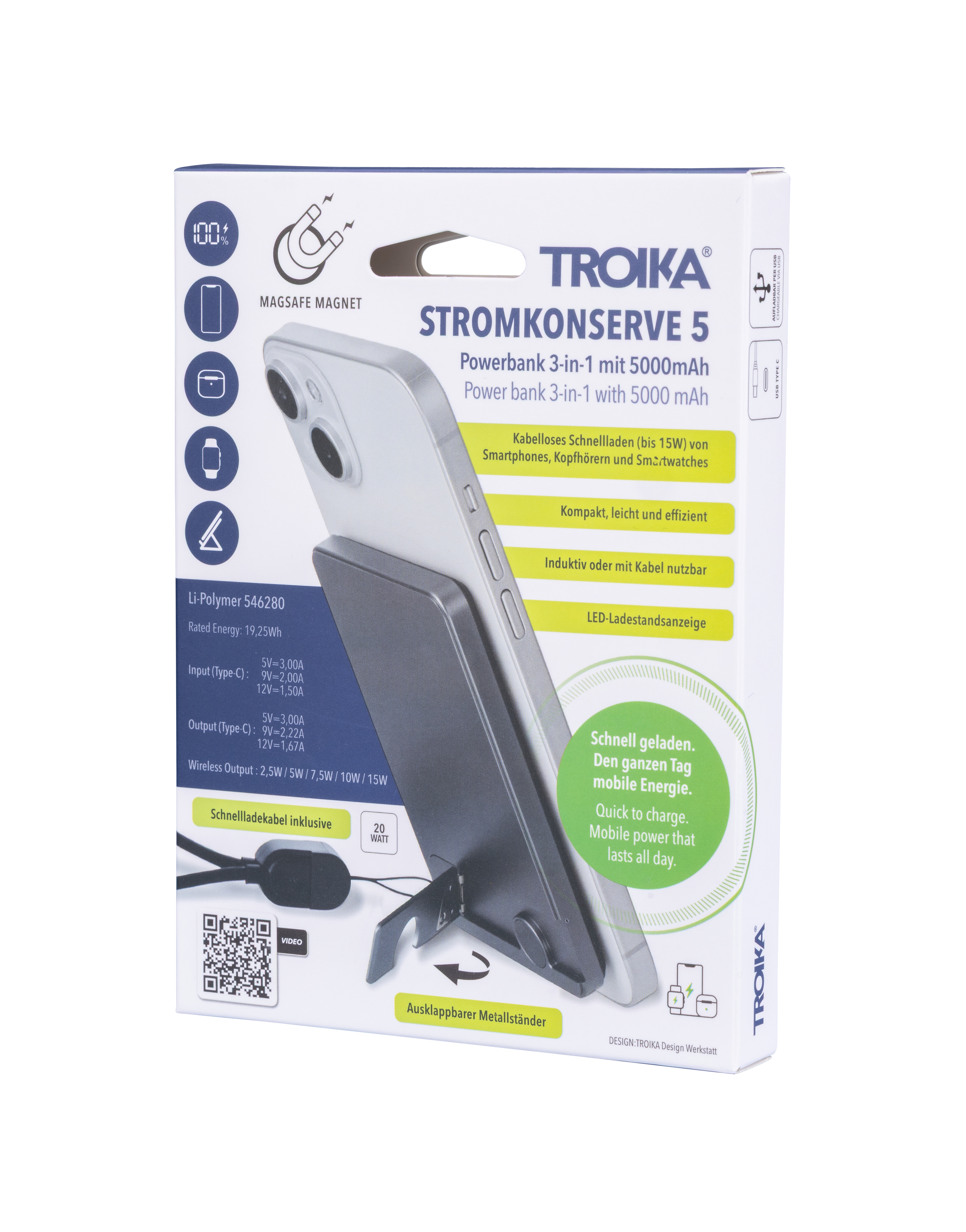 - Anschlüsse & Zubehör: USB-C auf USB-C Schnellladekabel (20 W Power Delivery, inklusive & fixierbar an der Powerbank)