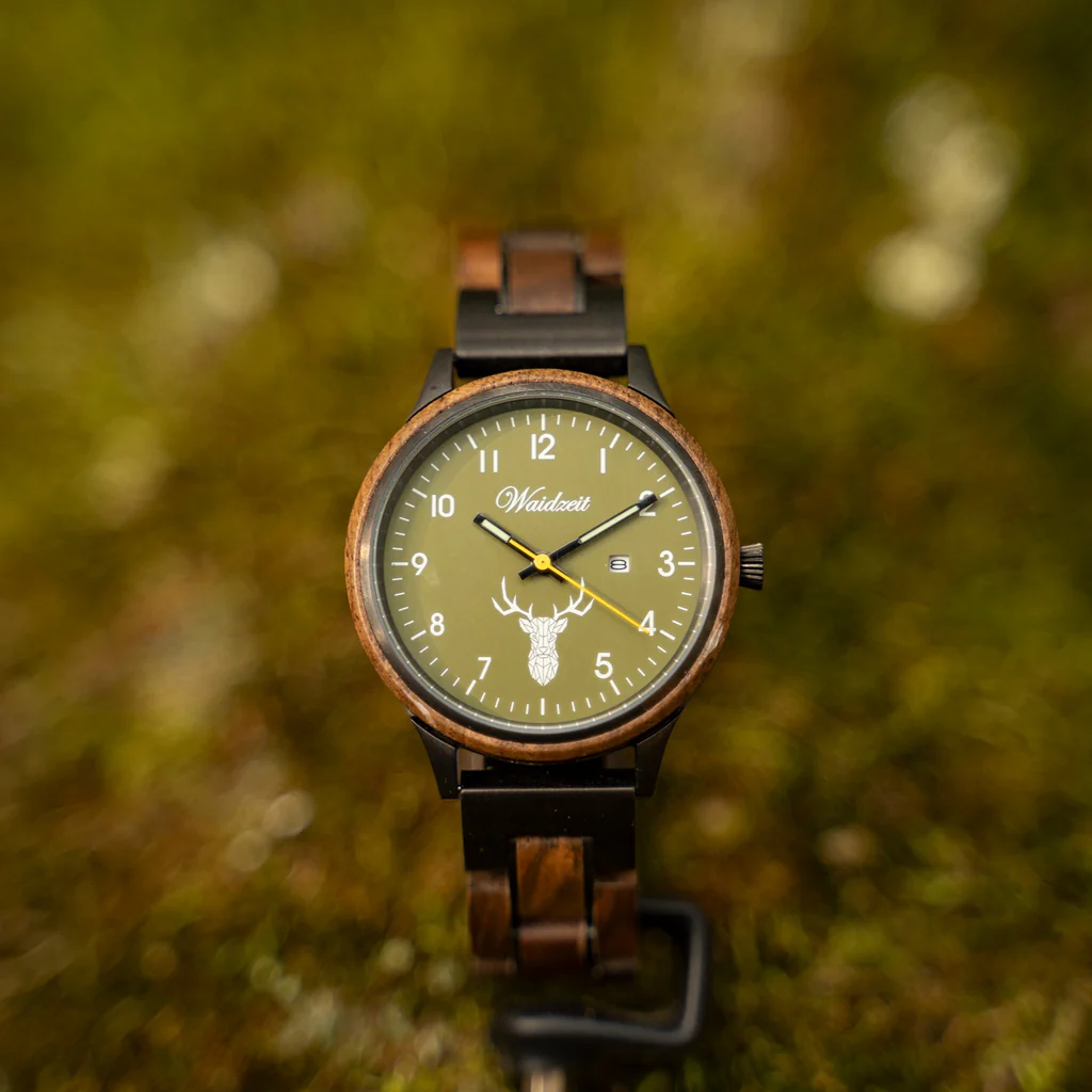 - Material: Holzgehäuse & Holzarmband oder Lodenarmband