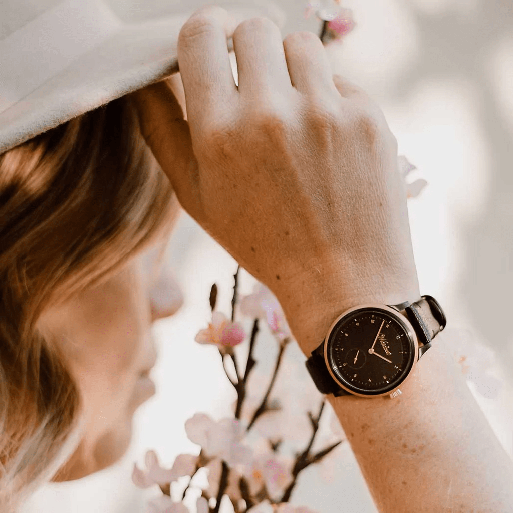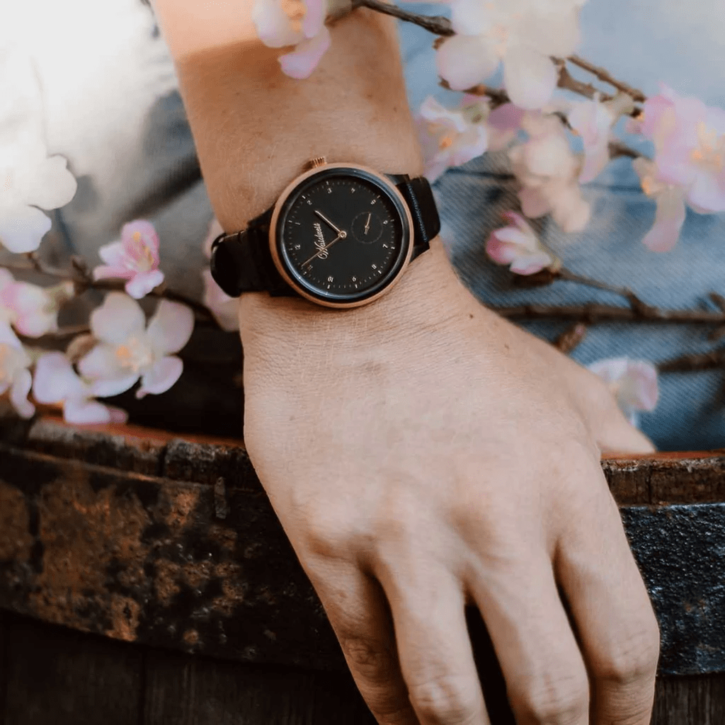 Zudem verfügt die Cherry Black Uhr über ein klassisch schönes, schwarzes Lederband.