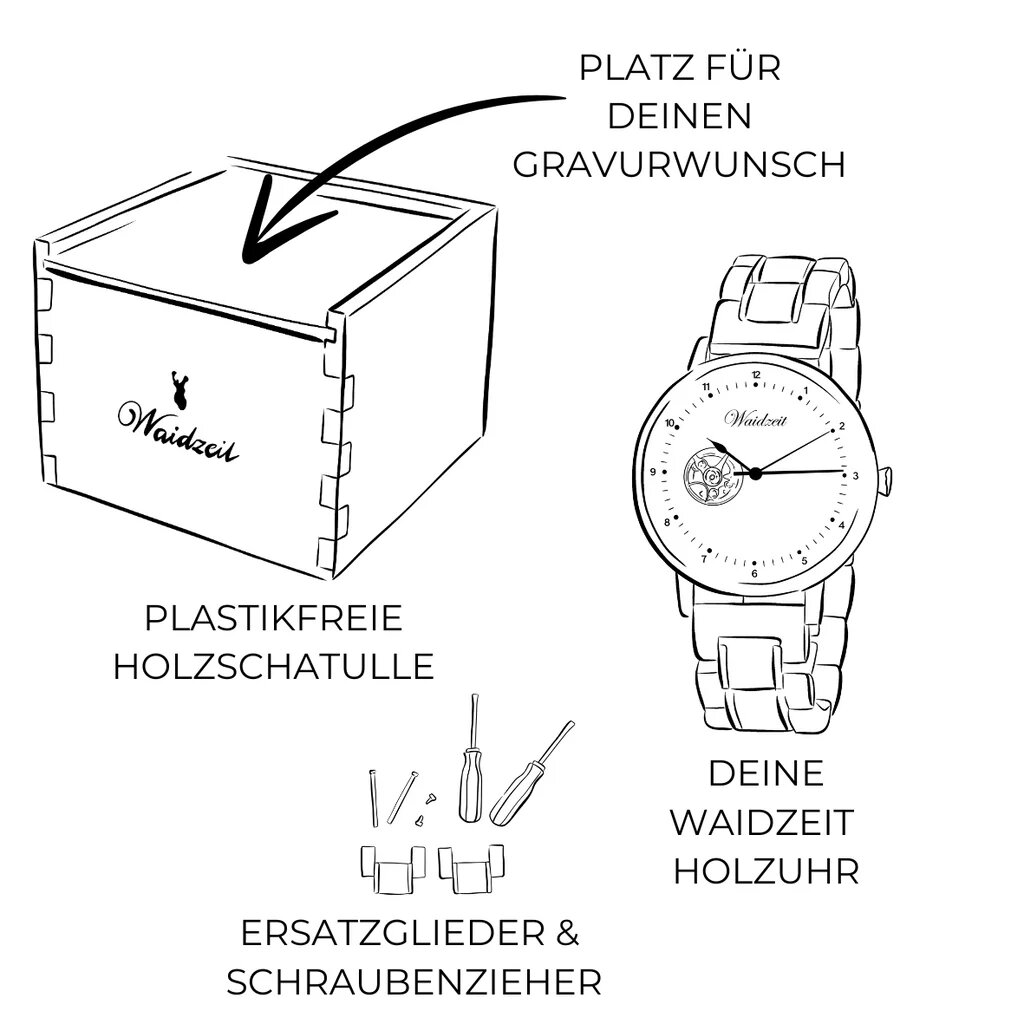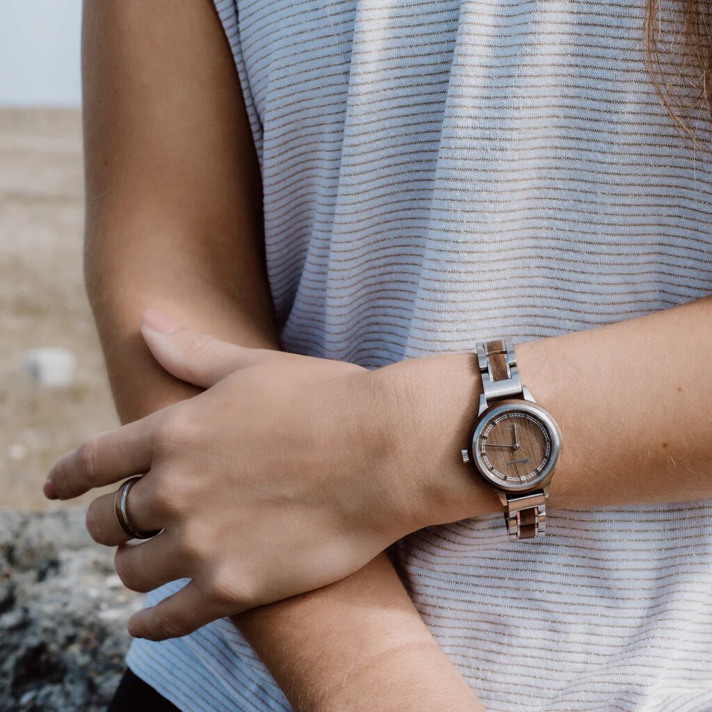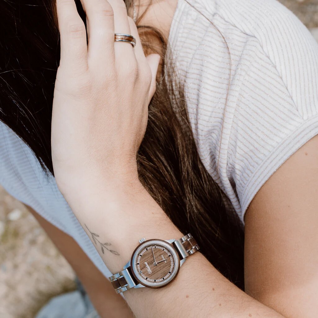 Die Damenuhr Petite Flocon besticht durch ihr anmutiges und filigranes Design, das feminine Eleganz verkörpert. Gefertigt aus hochwertigem Walnussholz, verleiht das Echtholzzifferblatt der Uhr eine natürliche und zeitlose Schönheit.