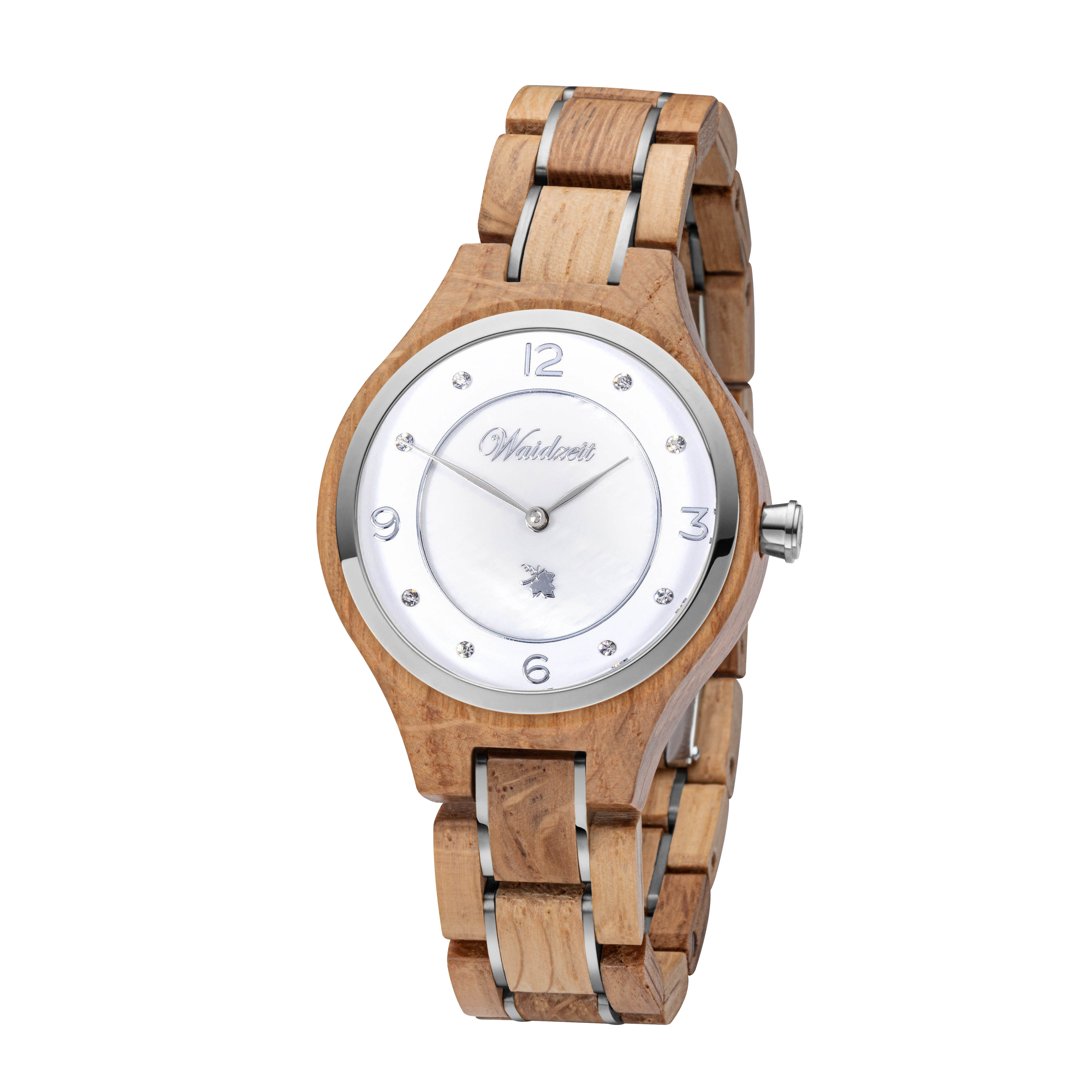 Mit dem schimmernden Perlmutt-Ziffernblatt, dem silberfarbenen Weinblatt und den Kristallsteinen wirkt diese Holzuhr sehr edel. Zudem rundet der Edelstahlring die Konstruktion auf harmonische Art und Weise ab.