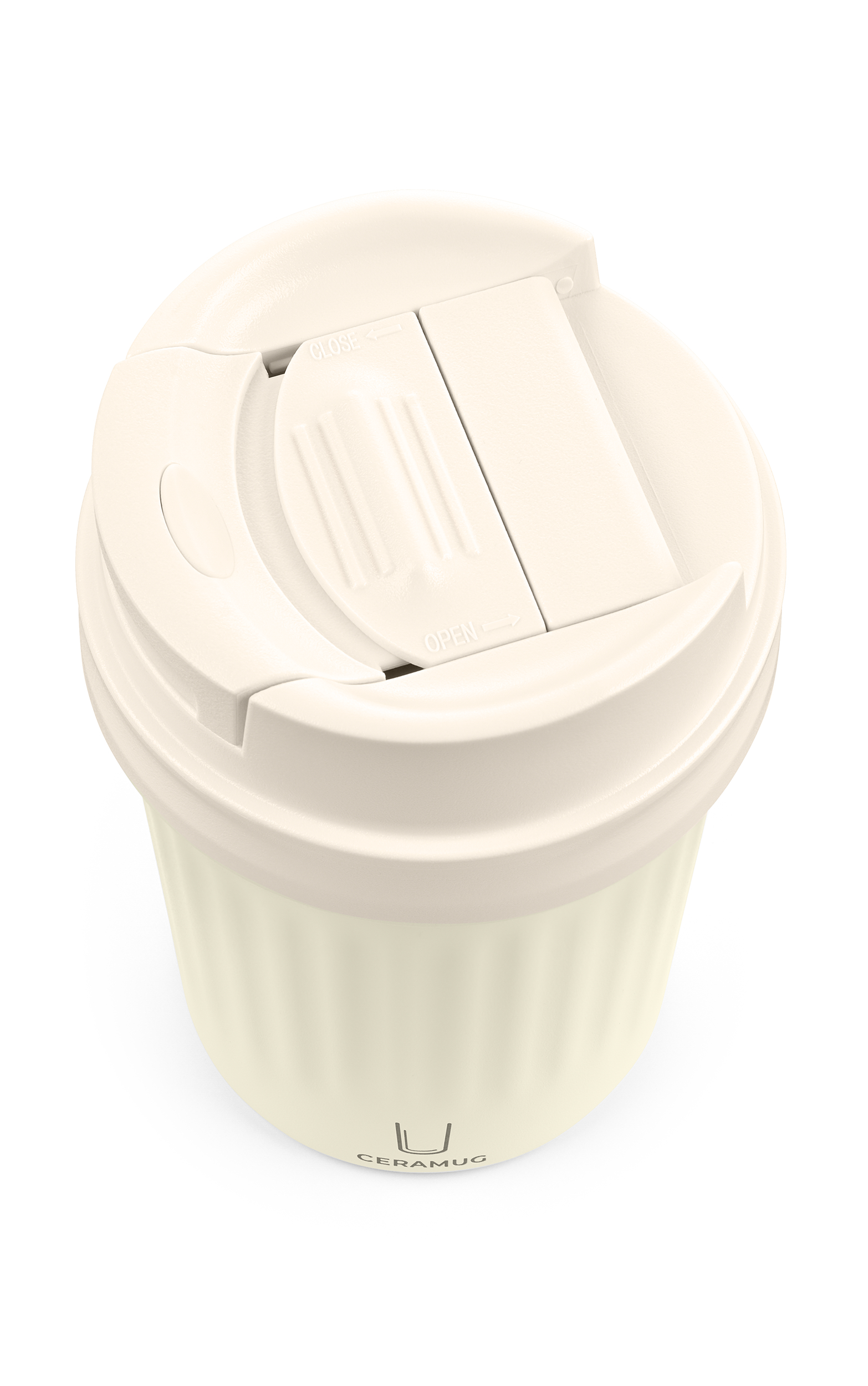 Der auslaufsichere Kunststoffdeckel mit praktischem Schiebeverschluss schützt zuverlässig vor Verschütten – perfekt für den täglichen Einsatz unterwegs. Das geriffelte Design bietet einen sicheren Halt und verleiht dem Becher eine moderne, elegante Optik.