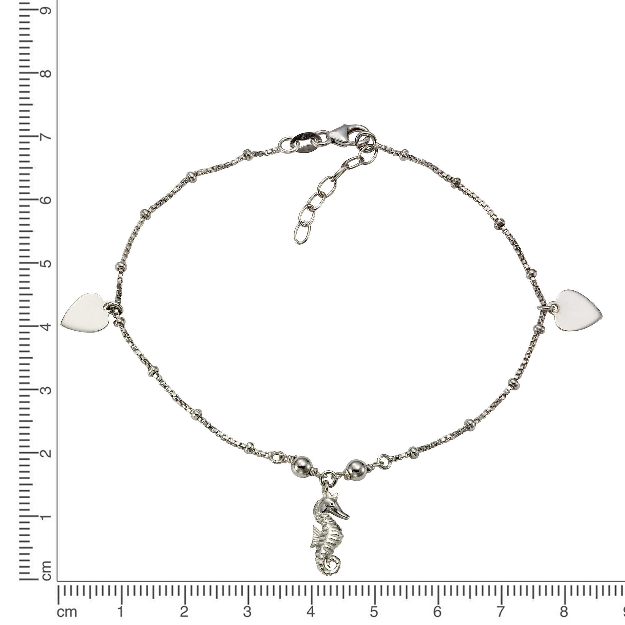 Verspieltes Fußkettchen aus rhodiniertem 925er Sterling Silber in eleganter Venezianerkette. Zwei glänzende Herzanhänger und ein detailreich gearbeitetes Seepferdchen verleihen dem Design eine maritime und zugleich romantische Note. Die hochwertige Oberfläche sorgt für dauerhaften Glanz und angenehmen Tragekomfort. Ein stilvoller Begleiter für warme Tage, ideal für Strandmomente oder als charmantes Geschenk.