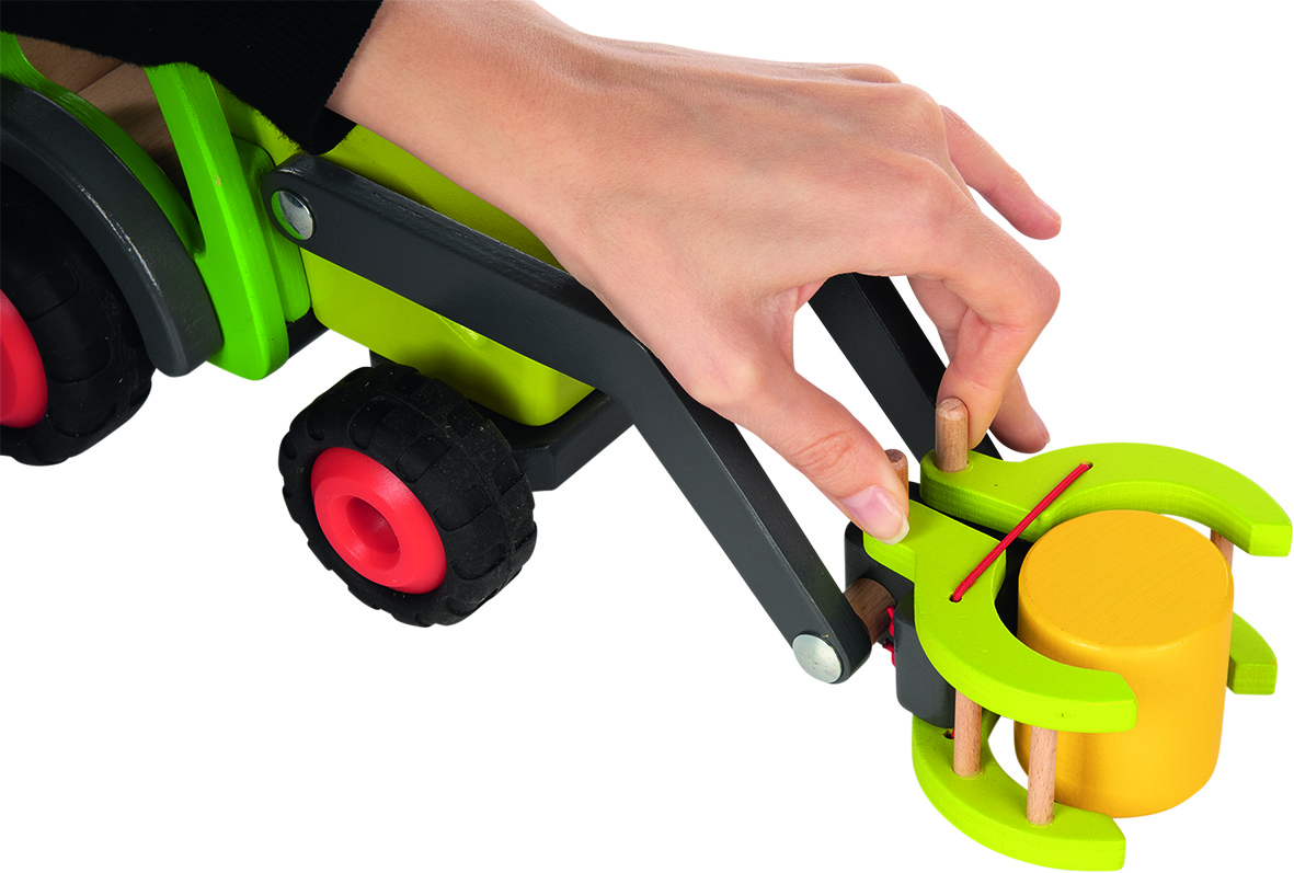 Der goki-premium Frontlader mit Heuwagen ist das Highlight auf dem Kinderzimmerbauernhof. Dieses detailreiche Spielzeug überzeugt durch seine erstklassige Verarbeitung und den hohen Spielwert. Der voll funktionsfähige Ballengreifer ermöglicht realistische Spielszenarien. Dank der Gummibereifung gleitet das lenkbare Gespann fast wie echt "über den Acker". Gefertigt aus massivem Buchenholz, ist dieses robuste Fahrzeug für eine lange Lebensdauer ausgelegt und wird so manche Heuernte unbeschadet überstehen.
