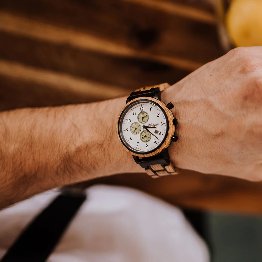 Durch die kunstvolle Einarbeitung des Wacholderholzes im Ziffernblatt, trägt dieser Chronograph die Seele des Gin in sich. Neben dem auffallend schönem Design und der Verarbeitung von Wacholder, ist das Gehäuse sowie das Armband dieser Herrenuhr aus up-gecycelten Barrique Eichenfass gefertigt.