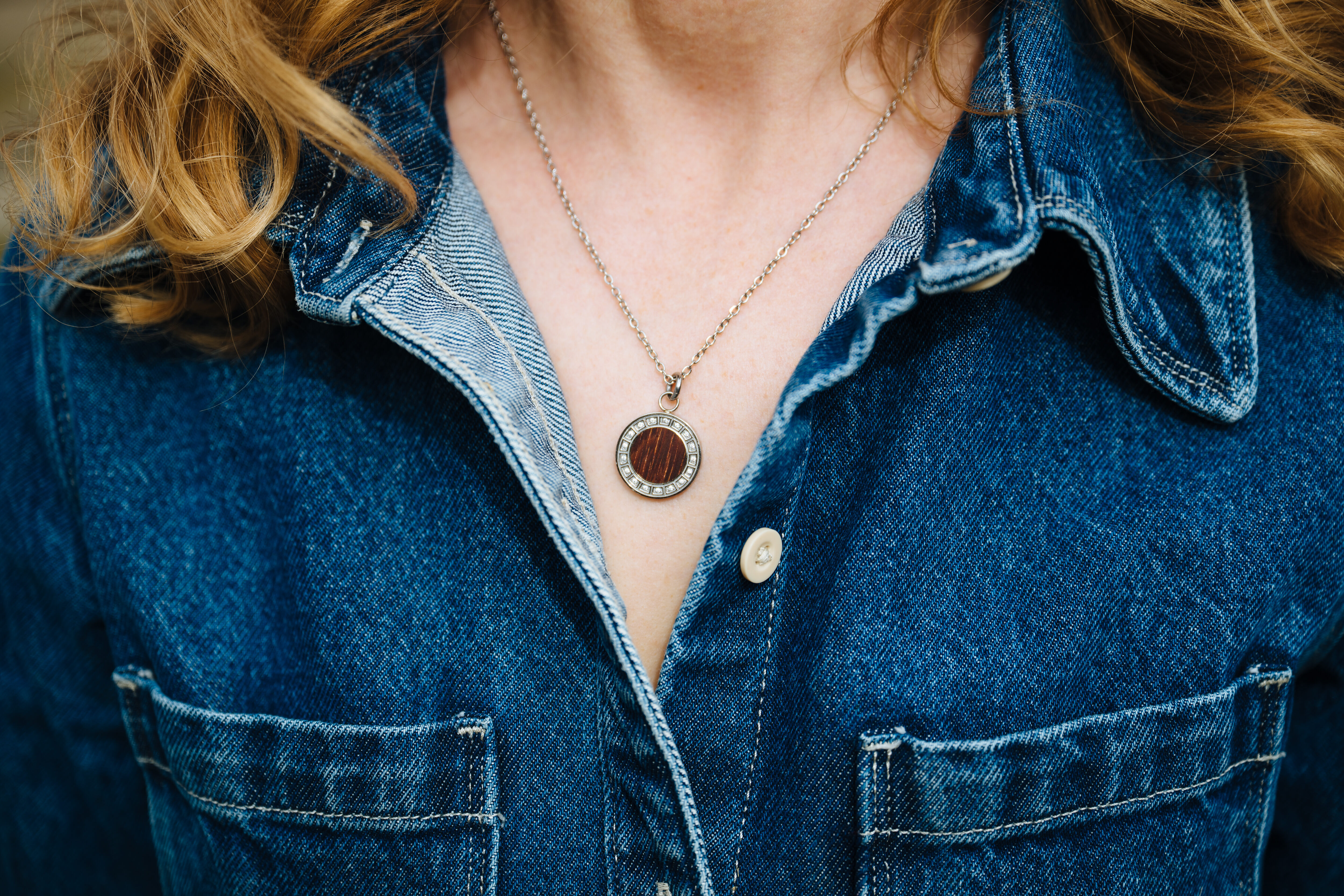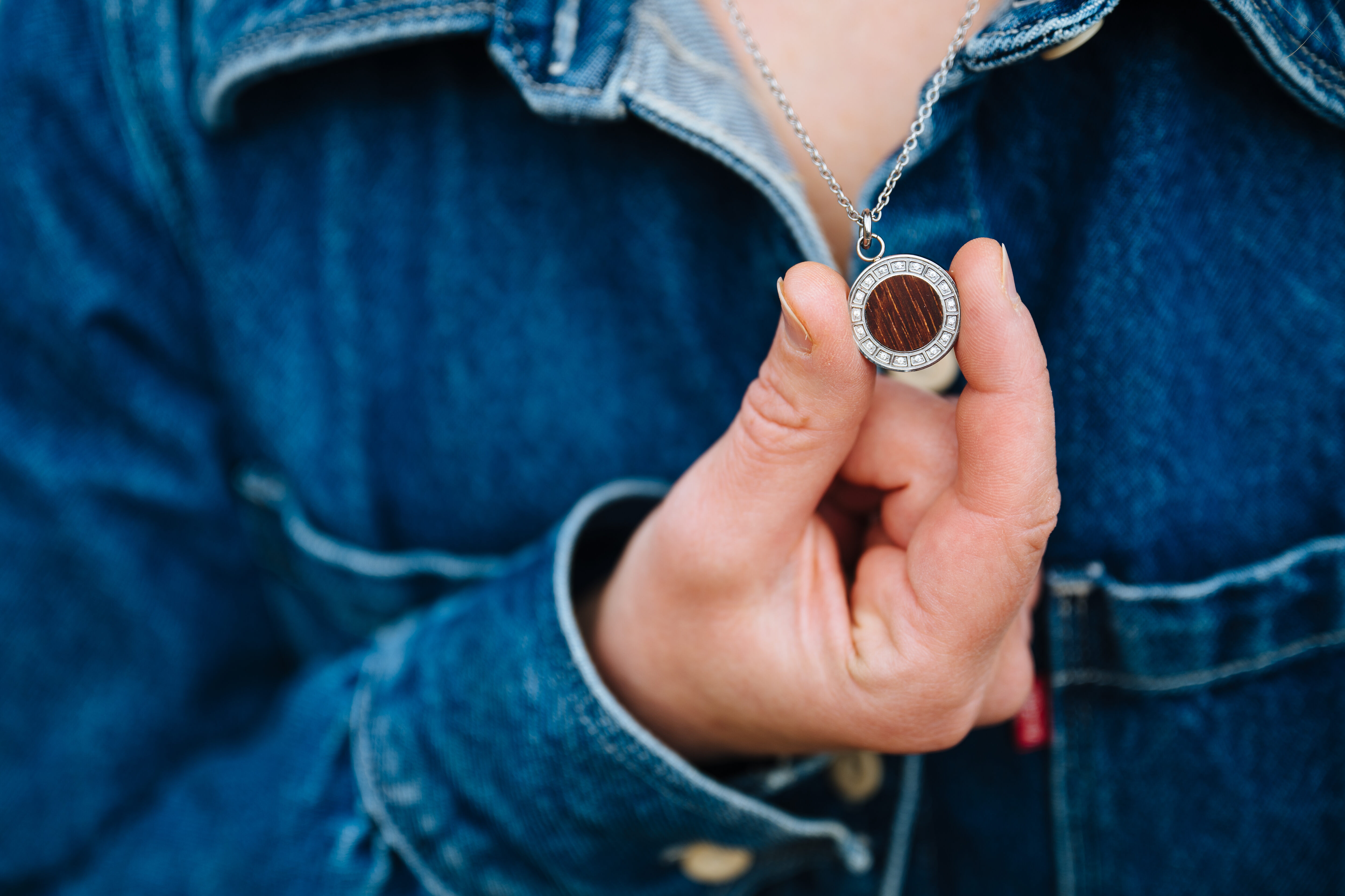 Die Grubenholz-Kette vereint modernes Design mit der industriellen Vergangenheit des Ruhrgebiets. Der Anhänger enthält ein filigranes Holzinlay aus original Grubenholz – gewonnen aus einer historischen Spurlatte des UNESCO-Welterbes Zollverein Schacht XII. Eingefasst in hochwertigen Edelstahl und veredelt mit funkelnden Kristallsteinen, entsteht ein außergewöhnliches Schmuckstück mit besonderer Symbolkraft.