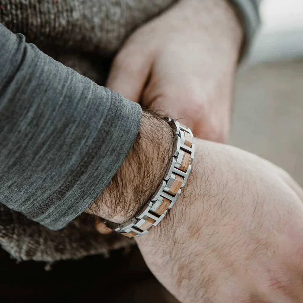 - Gehäuse aus Edelstahl eingefasst in Barrique Eichenholz