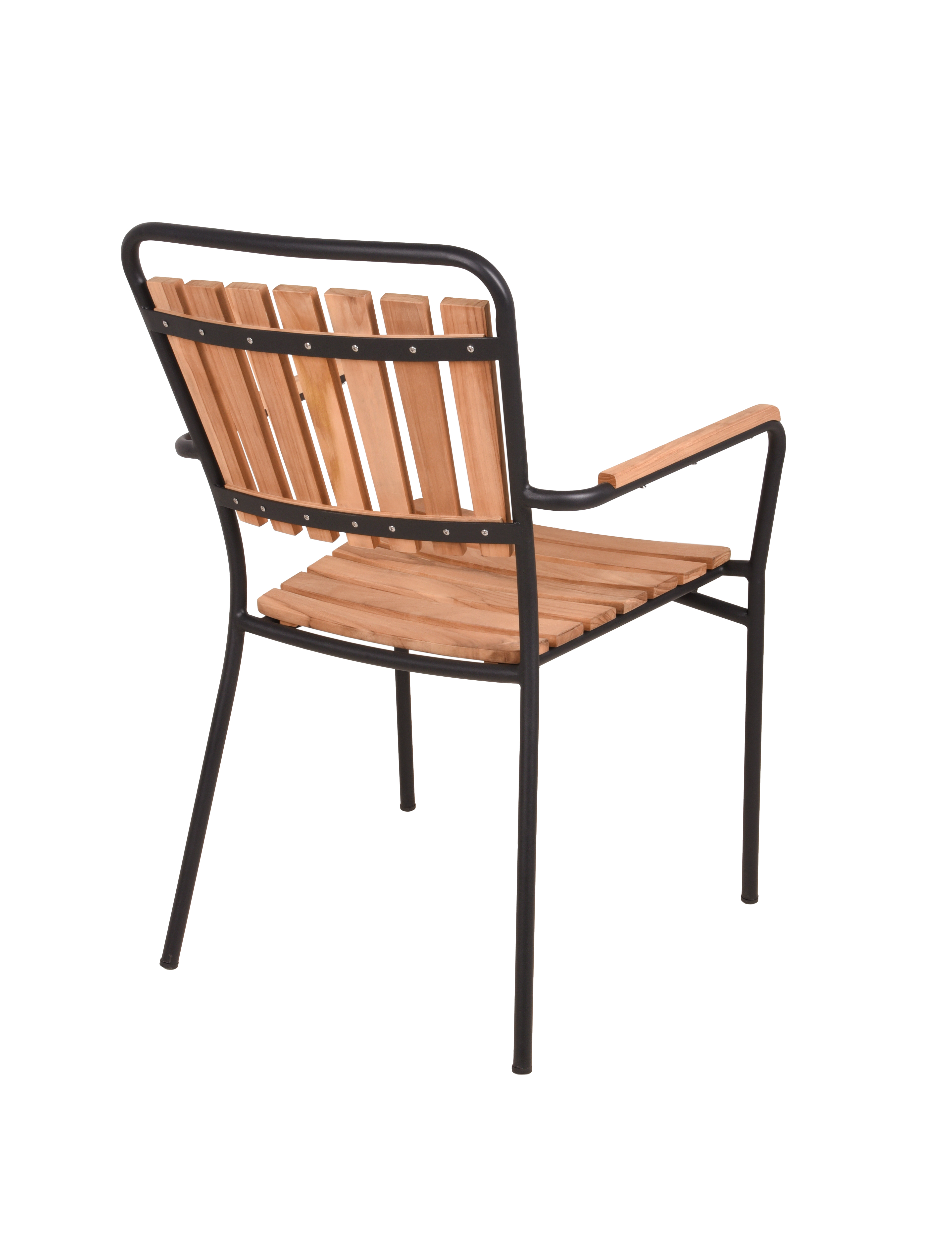 Der Stapelstuhl COVINA verbindet modernes Design mit hoher Funktionalität und ist die ideale Ergänzung für Garten, Terrasse oder Balkon. Sein robustes, schwarz verzinktes Stahlgestell gewährleistet Stabilität und Langlebigkeit, während die Armlehnen aus FSC®-zertifiziertem Teakholz eine warme, natürliche Note hinzufügen.
