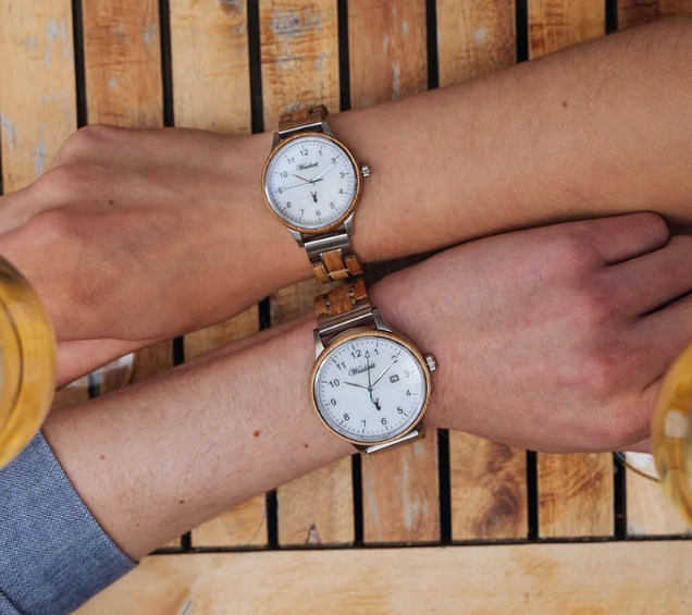 Das Paaruhrenset Grüner Panther von Waidzeit verkörpert mit seinem klassischen Design nicht nur das grüne Herz Österreichs, sondern auch die enge Verbundenheit mit der Natur. Das stilvolle, weiße Ziffernblatt aus Sölker Marmor verleiht den Holzuhren eine besonders edle Note. Der grüne Sekundenzeiger symbolisiert das Wappen der Steiermark und unterstreicht die regionale Bedeutung. Jede Uhr ist ein Unikat mit individueller Maserung und Struktur. Hergestellt aus Fassholz, das von steirischen Winzern stammt, ist diese Uhr ein besonderes regionales „Genussstück“ mit einem einzigartigen Charakter.